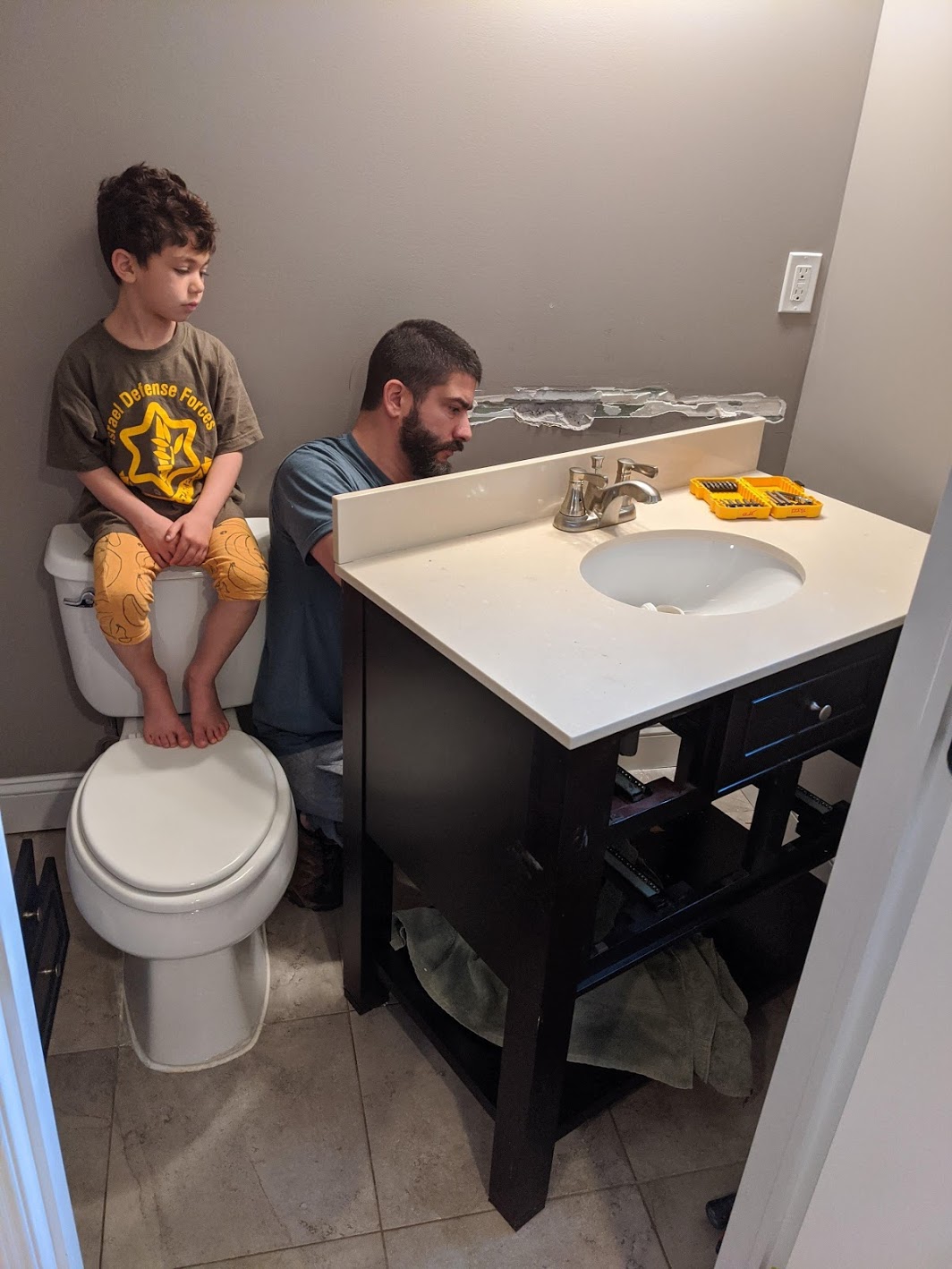 | step 3: removing toilet paper holder mount he broke when he was 1! it's been sitting there for 5 years, waiting for this remodel! |